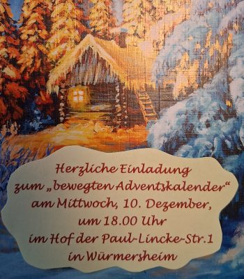 Wir dürfen Sie schon jetzt bitten, den 10. Dezember in Ihrem Kalender dick anzukreuzen. Denn an diesem Mittwoch macht unser kleiner Verein mit beim „Bewegten Adventskalender“ der Gemeinde. Bereits um 18:00 Uhr erwarten wir Sie im adventlich beleuchteten Hof der Paul-Lincke-Str. 1 in Würmersheim. Unser Enkelkinderchor wird den Abend musikalisch eröffnen, wir werden gemeinsam Adventslieder singen und gemütlich miteinander plaudern. Natürlich ist mit Glühwein, Wienerle und Weck auch für das leibliche Wohl gesorgt.